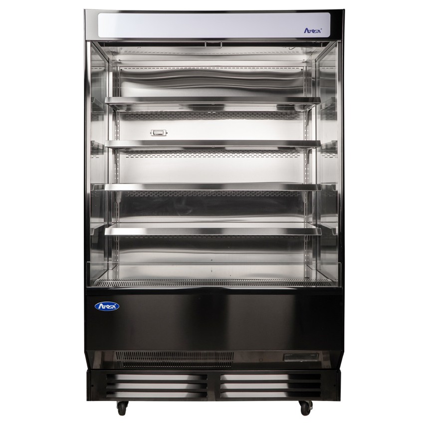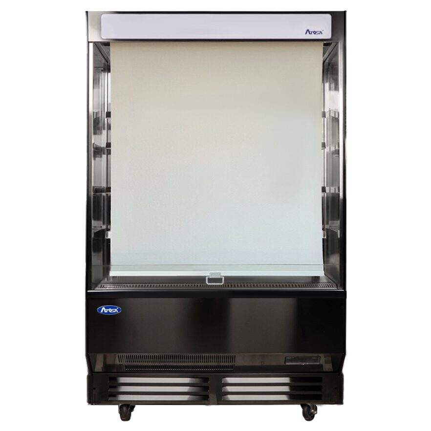 Open Air Merchandiser, 51-2/5″W x 28″D x 83″H, 16.5 cubic capacity, (4) shelves, full electronic controller, LED lighted header panel, LED lighting per shelf and interior top, pull down night curtain, stainless steel interior, black exterior, 4″ casters, R-290 natural refrigerant, 1HP, 120v/60/1-ph, 18.5 amps, cord with NEMA 5-20P, 1600 watts, cETLus, ETL-Sanitation