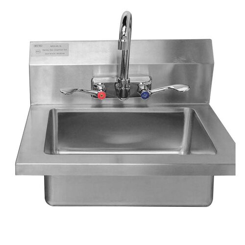 MixRite Hand Sink, 18″W, wall mount, 14″W x 10″ front-to-back x 5″ deep bowl, 18/300 series stainless steel, 6″H backsplash with 2″ return, 1-1/2″ drain, includes: gooseneck faucet with wrist blade handles, strainer, Z-clip mounting bracket, NSF