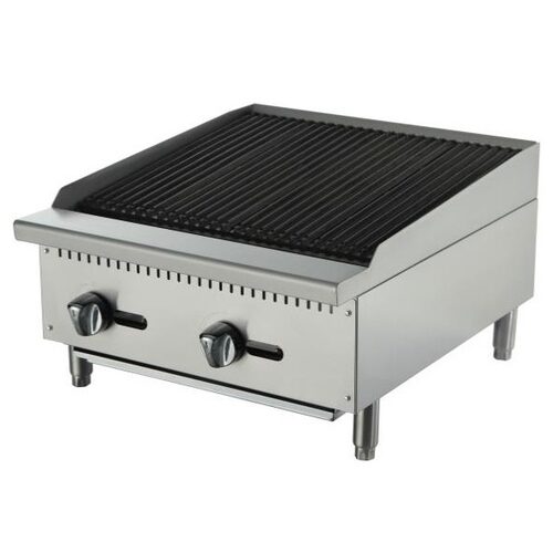 Charbroiler, natural gas, countertop, 24″ W, (2) stainless steel radiant burners, adjustable cast iron grates, independent manual controls, standing pilots, stainless steel construction, adjustable stainless steel legs, 70,000 BTU, cETLus, ETL-Sanitation