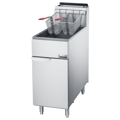 Inferno fryer, gas, floor model, 40 lb capacity, 15-1/2″W x 32-7/8″D x 45-1/8″H, (3) cast iron tube burners, millivolt control, 200°F to 400°F temperature range, (2) baskets, stainless steel welded tank, stainless steel exterior, 90,000 BTU, CSA-Sanitation, cCSAus
