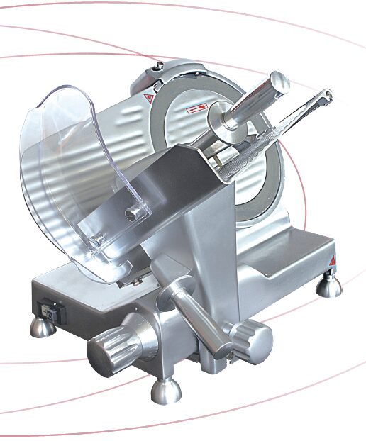 Deluxe Meat Slicer, 19.3″W x 22.7″D x 16.8″H, 12″ blade, thickness 0.2 -15mm, 40 slices per minute, 200mm maximum slice length, cast aluminum, 250W, 110v/60/1, NSF, cETLus