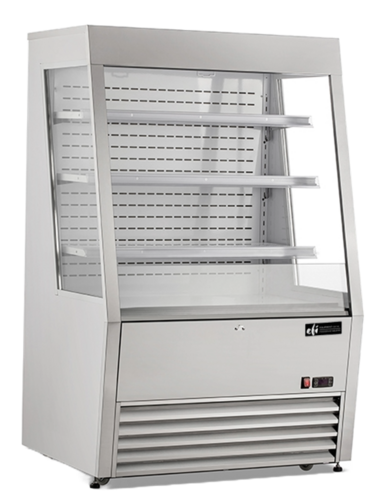 Versa Display Series Refrigerated Open Air Merchandiser, slanted front, 11.3 cu. ft. capacity, (3) adjustable shelves, pull-down night curtain, (4) casters), stainless steel exterior finish, 3/4 HP, 11.8 amps, R290 refigerant, 32°F to 53°F temperature range, cETLus, ETL-Sanitation