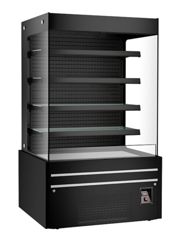 Refrigerated Open Merchandiser, 48″W, 26.8 cu. ft. capacity, bottom mounted self-contained refrigeration, open front, (4) stainless steel shelves, LED lighting (top & under each shelf), tempered glass sides, digital temperature control & display, 36°F to 50°F temperature range, automatic defrost, includes night curtain, R290 Hydrocarbon refrigerant, black exterior, (4) casters (2 with brakes), (2) adjustable leveling feet, 110v/60/1-ph, 3 amps, NEMA 5-20P, cETLus, ETL-Sanitation