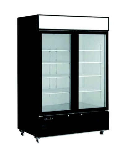 Refrigerator Merchandiser, two-section, 36.8 cu. ft. capacity, bottom-mounted self-contained refrigeration, (2) hinged glass doors, (8) adjustable plastic-coated wire shelves, (1°C to 8°C / 33°F to 45°F) temperature range, auto evaporation, black exterior, casters, 1/4 HP, 115v/60/1-ph, 3.3 amps, cord with NEMA 5-15P, cETLus, ETL-Sanitation