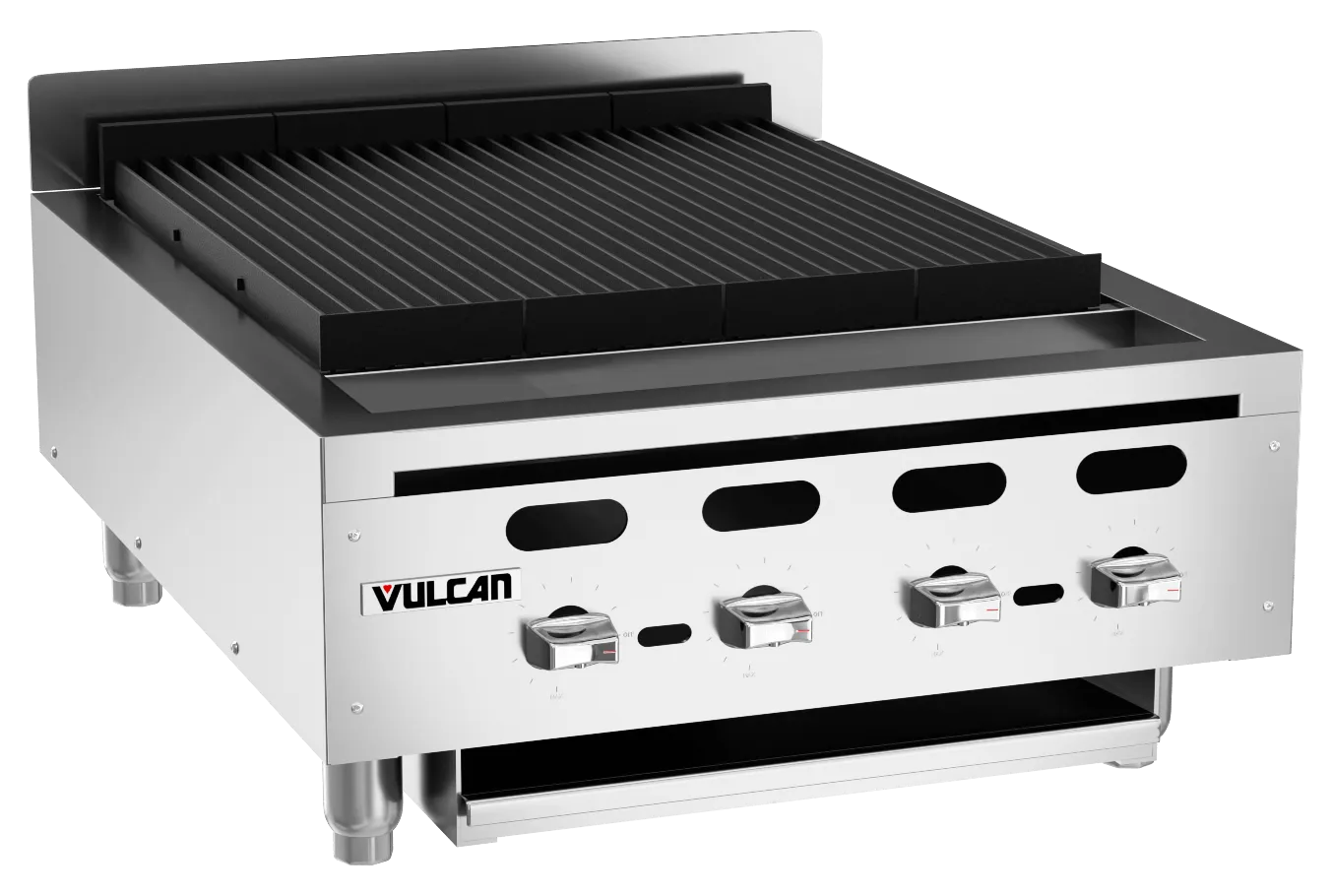 Achiever Charbroiler, countertop, 25-1/8″, (4) cast iron 17,000 BTU burners with standing pilots & cast iron radiants, heat deflector tray, supercharger burner dividers, high range infinite heat control valves, fully welded chassis, stainless steel front, sides, top trim, backsplash & grease trough, cast iron top grates, 4″ adjustable legs, 68,000 BTU, CSA, NSF